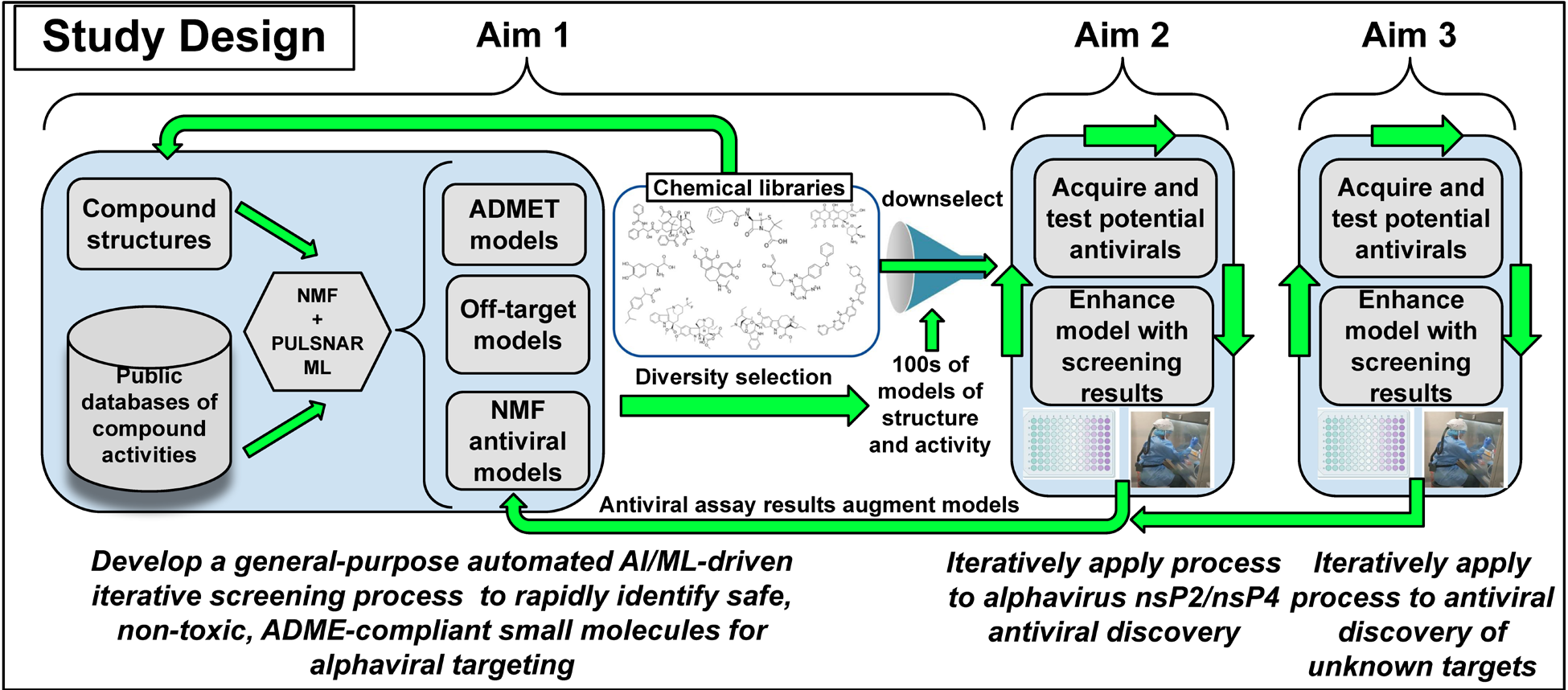 Alphaviruses are biothreat agents for which there are no approved vaccines or cure. Traditional drug screening for antiviral compounds has been plagued by a high rate of in vitro success followed by in vivo failure, due to lack of efficacy, off-target activity, or unfavorable toxicity/bioavailability characteristics. Screening costs can also prohibit large-scale testing for efficacy against viral infections, especially against high-containment pathogens. Here we propose to combine innovations in non-negative matrix factorization (NMF), semi-supervised positive-unlabeled Machine Learning/Artificial Intelligence (ML/AI), coupled with an iterative wet-lab experimental testing and feedback loop, to identify novel antivirals with favorable absorption, distribution, metabolism, excretion, and toxicity (ADMET) properties that target encephalitic alphaviral proteins involved in the viral life cycle. Our approach is unique in the combined use of novel unsupervised and semi-supervised ML/AI informed by multiple rounds of in vitro testing using live BSL-3 alphaviruses to improve both ML/AI model performance and in vivo efficacy